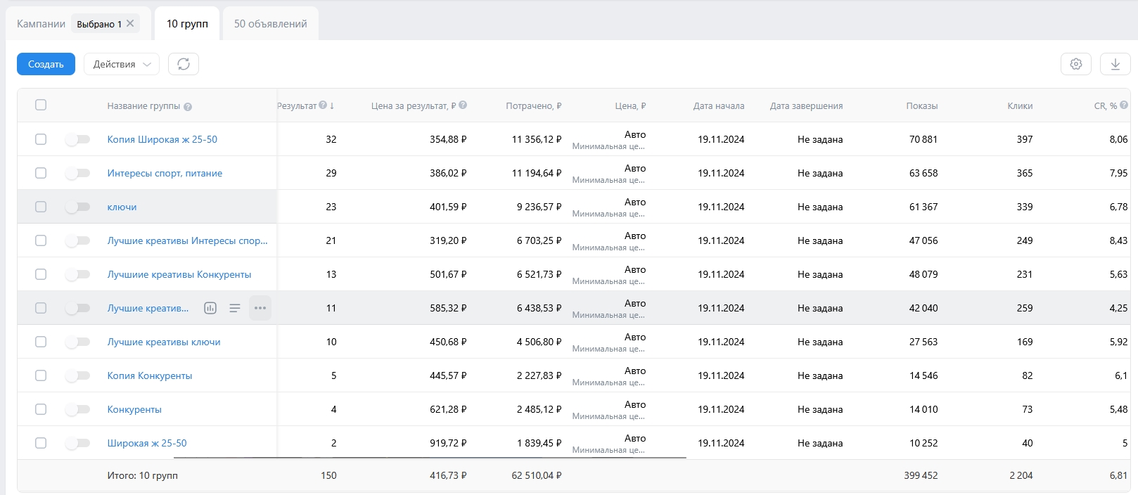 Реклама, это всегда тестирование гипотез. Поэтому, мы запустили сплит тест и выявили наиболее эффективные объявления и аудитории