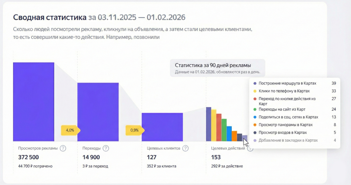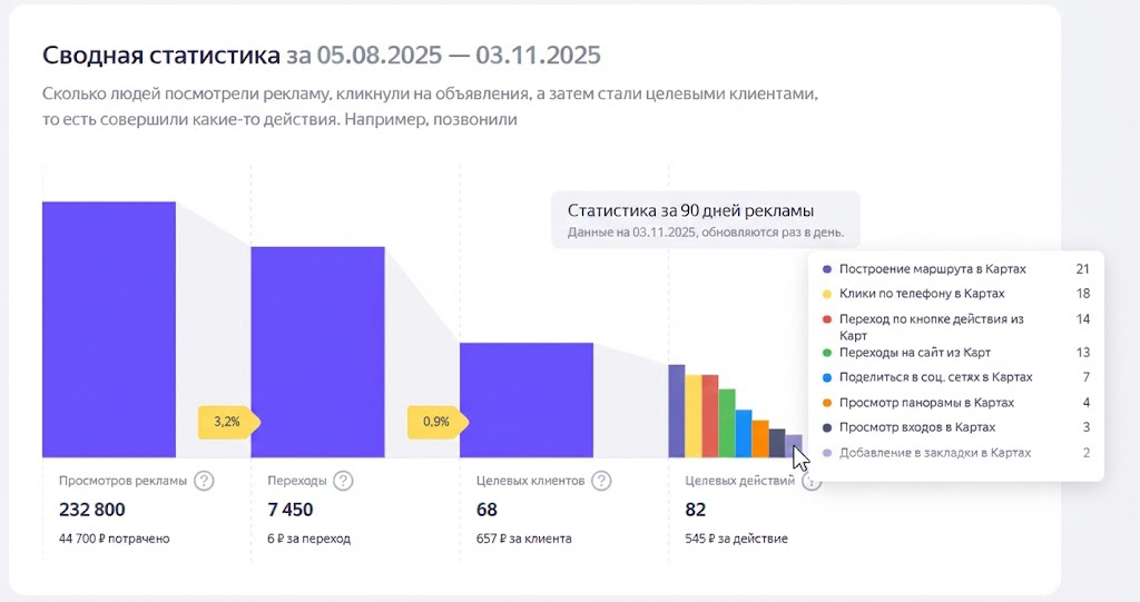 Уже на первом этапе заказчик начал получать стабильные звонки и заявки. Стоимость клиента была выше целевой, но для старта кампании результат оценивался как хороший.